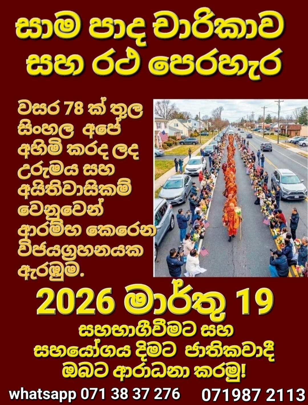 එබැවින් අප විසින් *2026.03.19* දින සංවිධානය කරනු ලබණ සාම පාද චාරිකාව සහ රථ පෙරහැර සඳහා ඔබේ සහභාගිත්වය සහ සහයෝගය සම්පත් දායකත්වය ලබා දෙන මෙන්