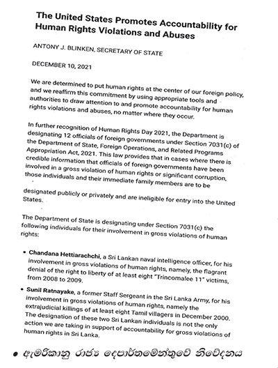මෙරට රාජ්ය නොවන සංවිධාන ජාලය හිටපු නාවික හමුදාපති වසන්ත කරන්නාගොඩටද සම්බාධක පැනවීම සඳහා ඇමරිකානු බලධාරීන් වෙත යොමුවී තිබූ බව වාර්තා විය. ඉරාකයේ යුද අපරාධ සිදුකළ බ්ලැක්වෝටර් ආරක්ෂක ඒකකයේ හයදෙනෙකුට ජනපති සමාව දුන් අතර ඔවුන්ට සම්බාධක පැනවූයේ නැත. මෙම හිටපු යුද හමුදා නිලධාරියාට සහ නාවික හමුදා බුද්ධි නිලධාරියාට ඇමරිකානු රජය තහනම් පනවා ඇත්තේ එක්සත් ජාතීන්ගේ හිටපු නිලධාරිනි යස්මින් සුකාගේ නිර්දේශ මතය.