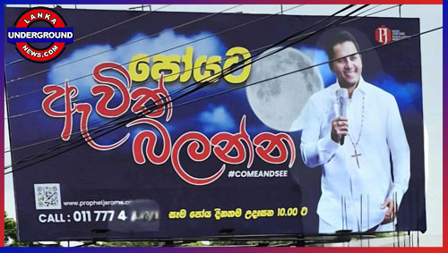 මේ ඡායාරූපයේ “කුරුසයක්” පැළද මයික්රපෝනයක් අතැතිව සිටින්නේ “ප්රොපට්” ජෙරම් ය. මෙහි විශාල අකුරෙන් දැක්වෙන්නේ “පෝයට ඇවිත් බලන්න” කියා ය. පසුබිමෙන් පෝයට පායන සඳෙහි රුවක් ද දක්නට තිබේ. ඊට අමතරව යටින් සිංහලෙන් සඳහන් කර ඇත්තේ “සෑම පෝය දිනකම උදෑසන 10:00ට” කියා ය. මේ විශාල පුවරුව පමණක් නොව මෙබදු ” බෝන් අගේන් ” ප්රවර්ධන පුවරු රැසක් ප්රදර්ශනයට තබා ඇත්තේ කටුනායක ගුවන් තොටුපලින් ශ්රී ලංකාවට ඇතුල් වී ඉන් පිටතට (එනම්, ශ්රී ලංකාව තුළට) පැමිණෙන අය කොළඹ – කටුනායක අධිවේගී මාර්ගය තෝරා ගැනීම දක්වා යන ප්රධාන මාර්ගය දෙපස ය. ඒ සෑම පුවරුවක්ම, මේ පුවරුව මෙන්ම රාත්රී ආලෝකයෙන්ද අංග සම්පූර්ණ කර තිබේ.