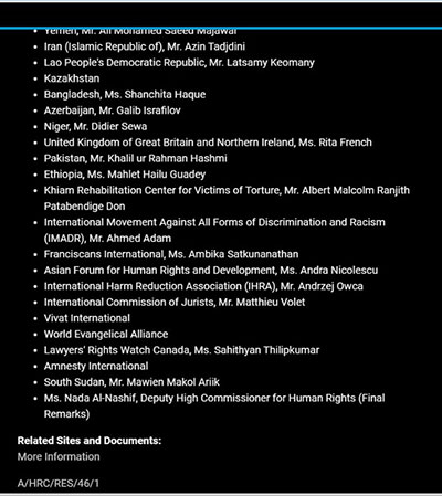 එහිදී මුලින්ම සාමාජික රාජ්යයන් විසින් ඒ පිළිබඳව අදහස් දැක්වූ අතර ඉන් පසුව එළැඹියේ මානව හිමිකම් කොමිසම තුළ ලියාපදිංචි වූ එන්ජී ඕ සංවිධාන විසින් අදහස් දක්වන අවස්ථාවය.