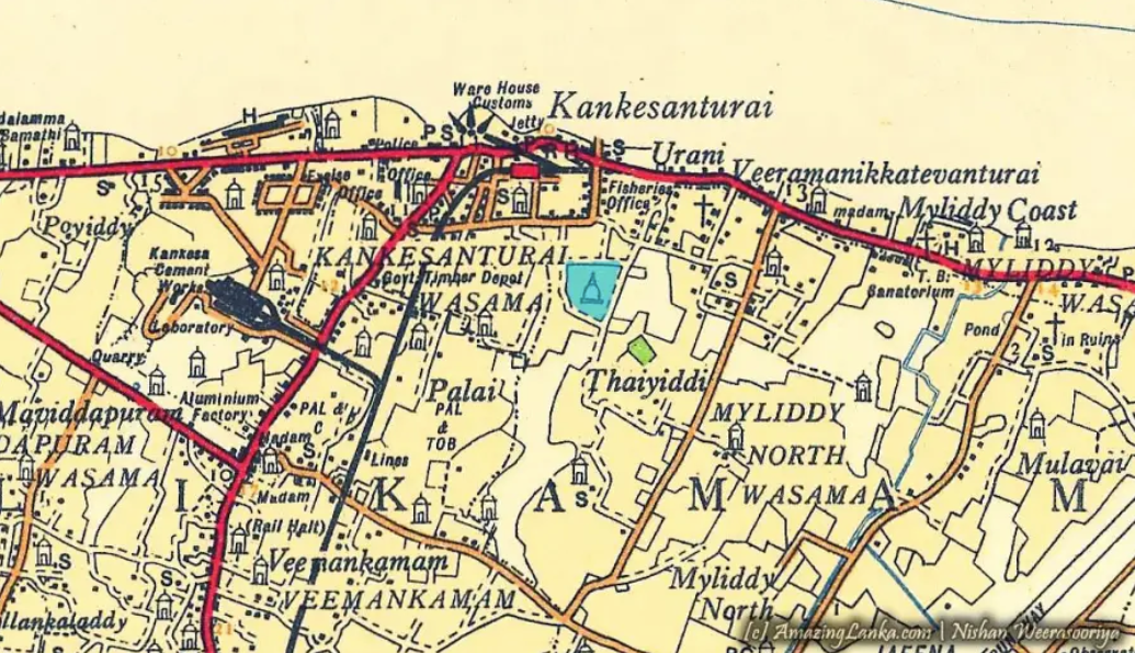 මිනින්දෝරු දෙපාර්තමේන්තුව විසින් ප්රකාශයට පත් කරන ලද 1959 සංශෝධනය කරන ලද යාපනයේ අඟලේ (1: 63,360) සිතියමහි මෙම පන්සල් භූමිය ඉංග්රීසි හා දෙමළ අනුවාද දෙකෙහිම පැහැදිලිව සලකුණු කර ඇත. මෙම සිතියමට අනුව විහාරස්ථානය අක්කර 15 ක පමණ භූමි ප්රමාණයක් ආවරණය කර ඇත. තවද බෝධීන් වහන්සේ සතර නමක් පමණ ඉතා සරුවට මෙහි වැඩ සිට ඇත.