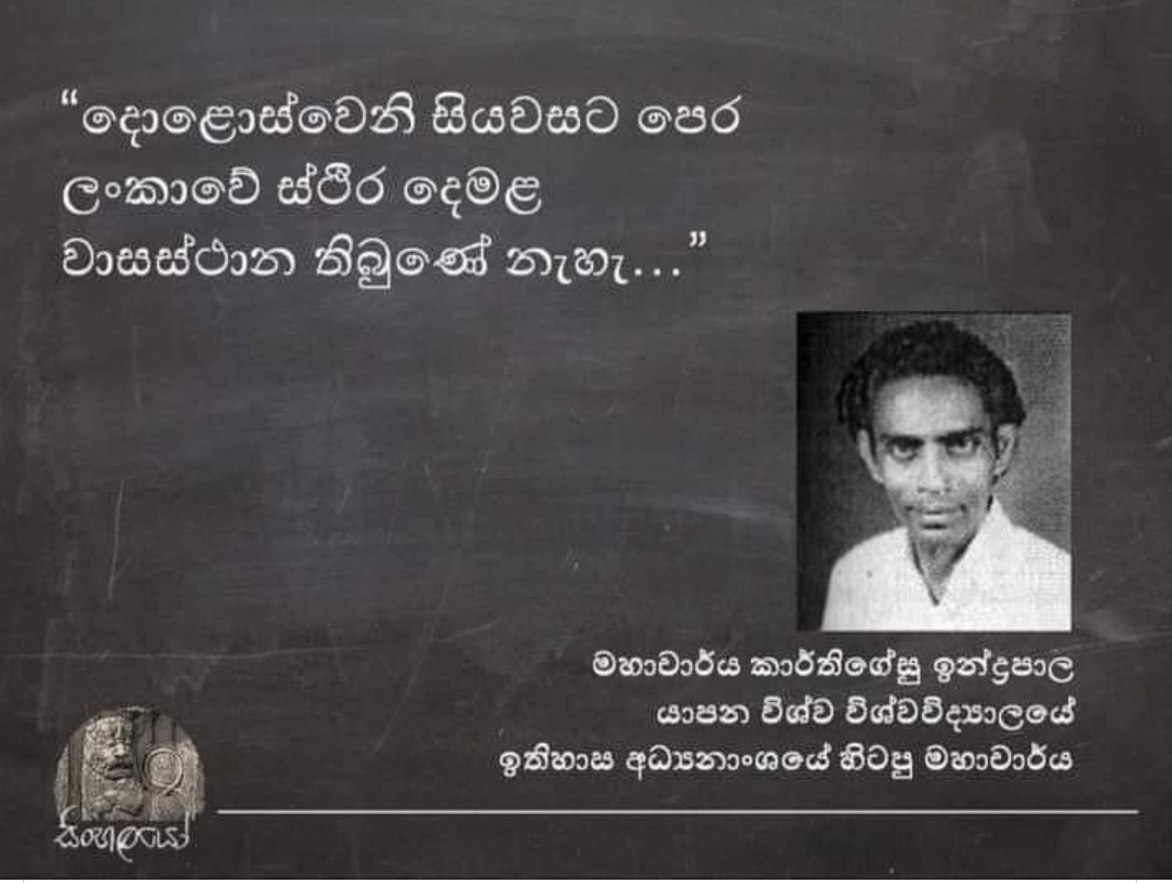 - මහාචාර්යය ඉන්ද්රපාල කාර්තිගේසු අනුව 12-13 වන සිය වෙනකම් දෙමළ ජනාවාස තිබුනේත් නැත්නම් ඉන්පසුවද එම ජනාවාස අඛණ්ඩව ලංකාව පුරා ව්යාප්ත වූ බවට සාක්ෂිත් නැත්නම් මෙරටේ දෙමළ මුල් පුරවැසියන් කියන්නේ කෙසේද?