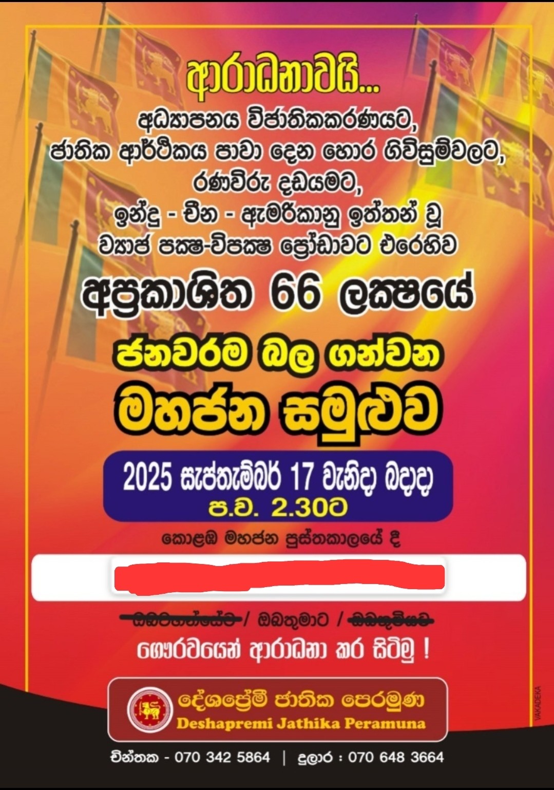 සුද්දාගෙ කාලේ ඉඳන් මේ කළු සුද්දෝ කරේ තියාගෙන යන විජාතික වැඩපිළිවෙළට එරෙහිව ජාතිකත්වයේ දැනුම පදනම කරගෙන අභිමානවත් ජාතියක්, අභිමානවත් පුරවැසියෙක් බිහි ක්කරන්න, අපි ඒ හැට හය ලක්ෂය ඉල්ලන ජාතිකවාදි පෙරළියේ ගාමක බලවේගය වෙමු.