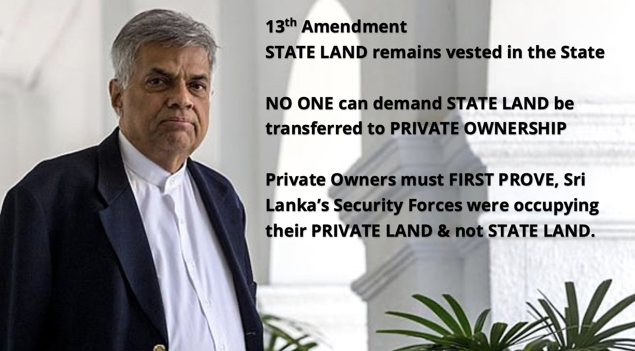 When President Ranil says land occupied has to be given – he must be told that it is only private lands that are occupied by the State that should be given & NOT STATE LAND, as the constitution clearly says that STATE LAND IS VESTED IN THE STATE (REPUBLIC) and NOT THE PROVINCES.