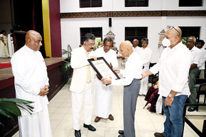 Vishwa Bushana Special Award’ for Master Artist Professor H.A. Karunartane at this event: L to R – Mr. Chandra Nimal Wakishta – President All Ceylon Buddhist Congress, Chief Guest Presidents Council Jayantha Jayasuriya, Prof. Susiripala Malimbada- President Educational Council, Dr H.A. Karunaratne – Senior Master Artist Professor H.A. Karunartane.