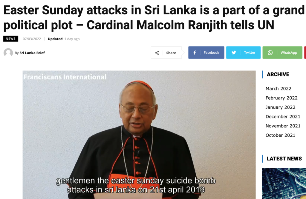 On 21st April 2019, 8 suicide bombers carried out attacks on 3 churches, 3 hotels and 1 guest house. This mass suicide killed close to 300 people and has injured many more. It took place during the government of President Maithripala Sirisena & Prime Minister Ranil Wickremasinghe. The suicides took place inspite of over 90 intel warnings from India before the attacks, giving even names of the suicide bombers & locations of the attacks. These facts are well known to all in particular the Cardinal. The subsequent investigations reveal that a number of people (politicians, public officials & others) were also aware of the intel on the attacks while weeks previously there was enough of evidence to presume something was brewing after discovery of weapons & other untoward incidents. However, suddenly, the whole narrative is being changed & the key to returning to the correct narrative is found in the tape released by Zaharan & his suicide team hours before the suicide attacks.