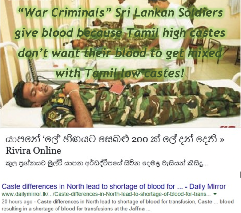 The Tamil politicians and the LTTE Diaspora may blow hot & cold, spend lavishly on propaganda projecting Sinhalese as discriminating them, committing war crimes & stoop so low as to claim genocide, but the truth of the matter is that divisions and discriminations amongst Tamils is such that Tamils will not even donate blood because of their caste. Tamil caste system is such that Tamils do not donate blood lest their “high caste” blood gets mixed with “low caste” blood. Such is the psyche that prevails. If anyone is awestruck by this, verify for yourself & accept the truth humbly & then question the unfair charges being leveled against Sri Lanka’s Armed Forces.
