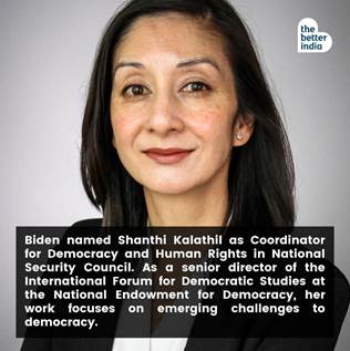 - NATIONAL SECURITY COUNCIL – (Ms) Shanthi Kalathil – Coordinator for Human Rights and Democracy.