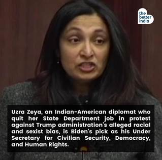 - Uzra Zeya – Under Secretary for Democracy & Human Rights – Dept of State: Formally South Asia Human Rights – State Department 1990-2018 US Foreign Service – 2012-2014 Asst. Sec. – Bureau of Democracy & Human Rights.
