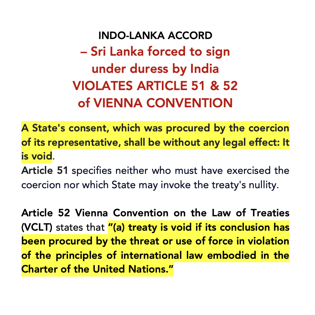 3. Indo-Lanka Accord was signed under Coercion/ Duress violating Artciel 52 of Vienna Convention. A treaty is void if its conclusion has been procured by the threat or use of force in violation of the principles of international law embodied in the Charter of the United Nations. Indo Lanka Accord violated Article 52 of Vienna Convention & is not valid.