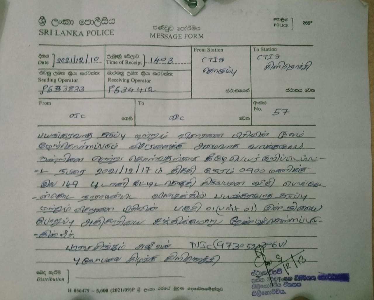 The summons directed Sujeevan to appear at the offices of the TID on Friday, December 17.