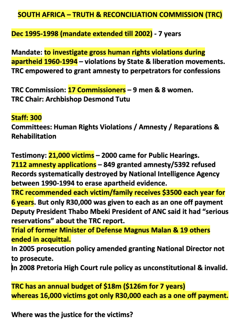 In South Africa’s context it was to look at human rights abuses during apartheid, share the traumas & then unite in healing. Basically, it was to take the incidents, cry over what happened & just move on because there was little retributive justice, in fact there was hardly any justice.