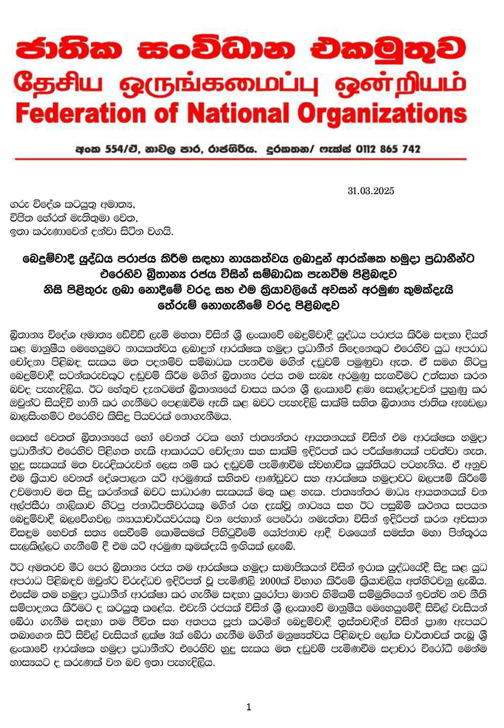 බෙදුම්වාදී යුද්ධය පරාජය කිරීම සඳහා නායකත්වය ලබාදුන් ආරක්ෂක හමුදා ප්රධානීන්ට එරෙහිව බ්රිතාන්ය රජය විසින් සම්බාධක පැනවීම පිළිබඳව නිසි පිළිතුරු ලබා නොදීමේ වරද සහ එම ක්රියාවලියේ අවසන් අරමුණ කුමක්දැයි තේරුම් නොගැනීමේ වරද පිළිබඳව සදහන් කරමින් ජාතික සංවිධාන එකමුතුව විසින් එහි කැඳවුම්කරු ආචාර්ය ගුණදාස අමරසේකර මහතාගේ අත්සනින් යුතුව ලිපියක් යොමුකර ඇත.