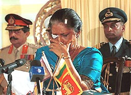 Sri Lankan President Chandrika Kumaratunga, right, is overcome by emotion at her residence in Colombo, Sri Lanka Wednesday December 22, 1999 after winning a second term in office. Kumaratunga survived a suicide bomb attack on Saturday during her final rally of the election campaign. (AP Photo/Gemunu Amarasinghe)