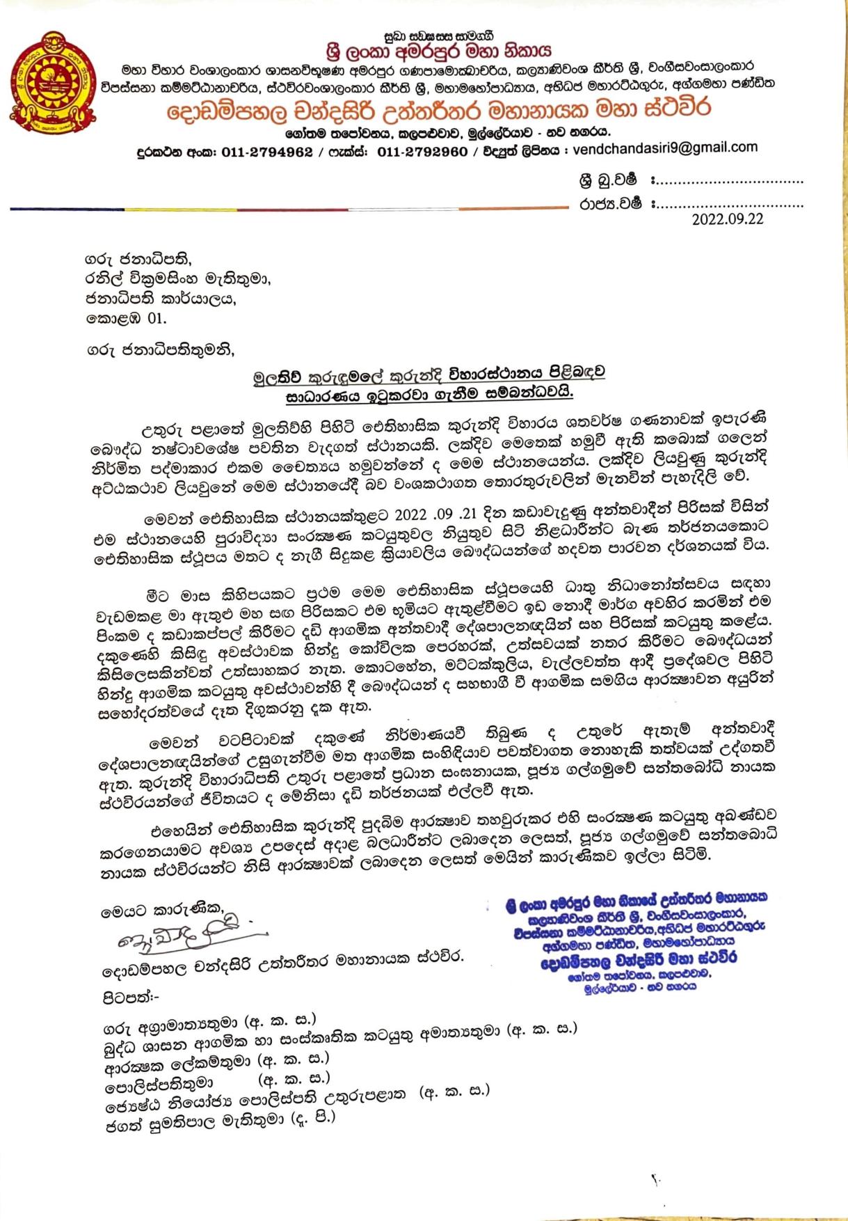 The Chief Thero of the Temple has written to the President about these destructions and has sought the security arrangement to the temple.