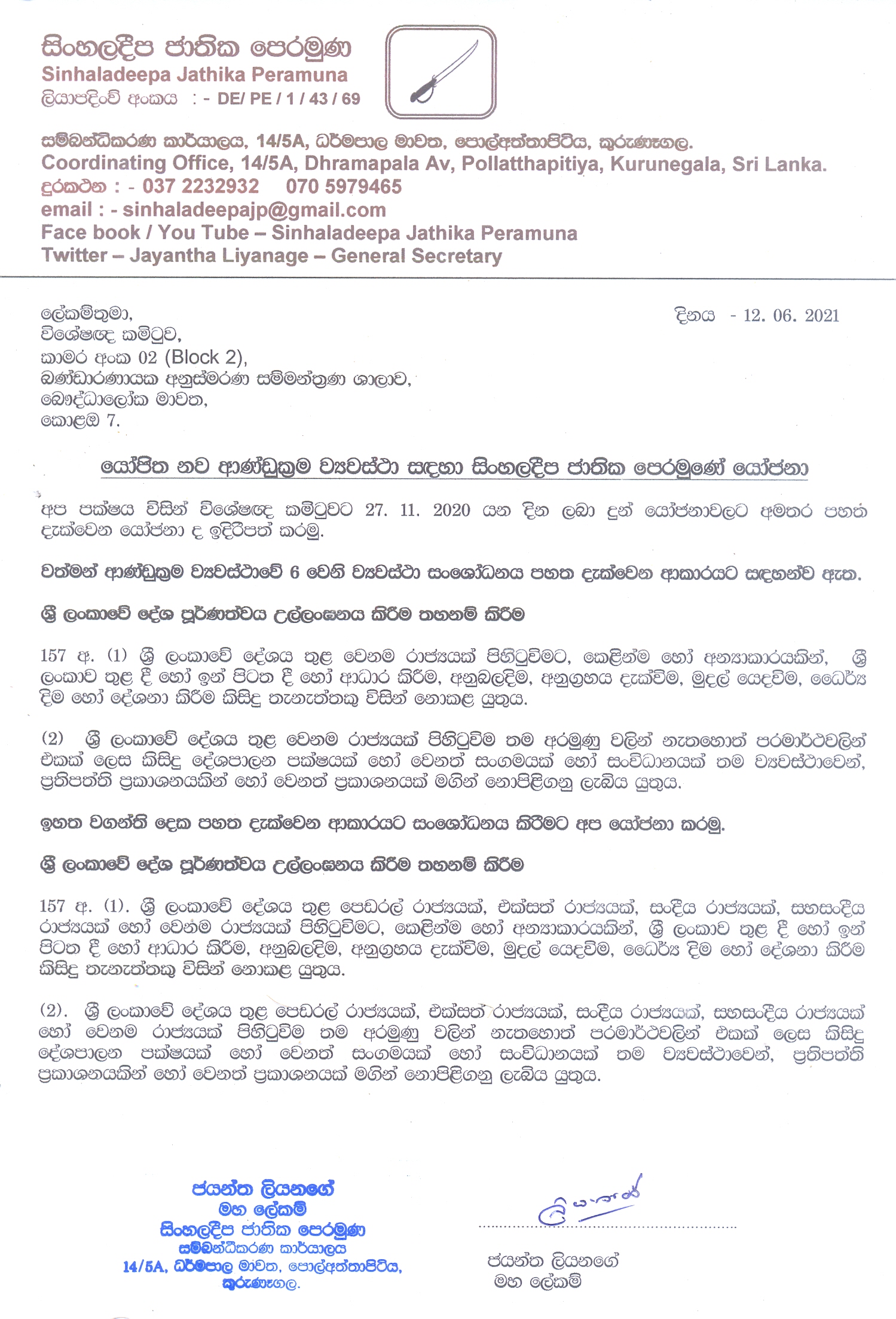 The patriotic political party, Sinhaladeepa Jathika Peramuna has issued a media brief with their proposals to the proposed new constitution of Sri Lanka.