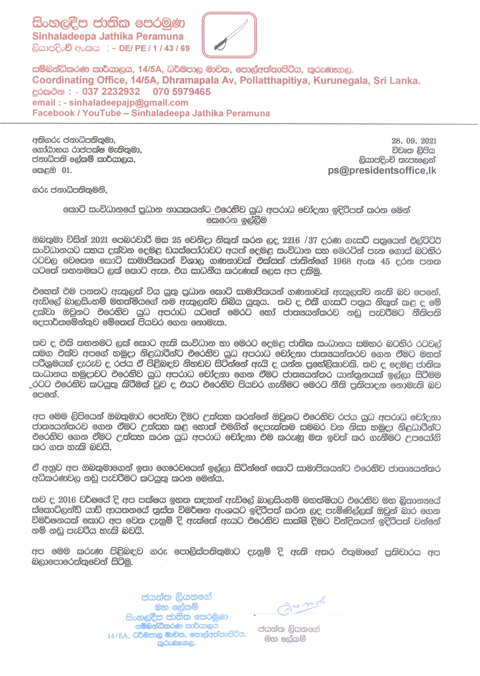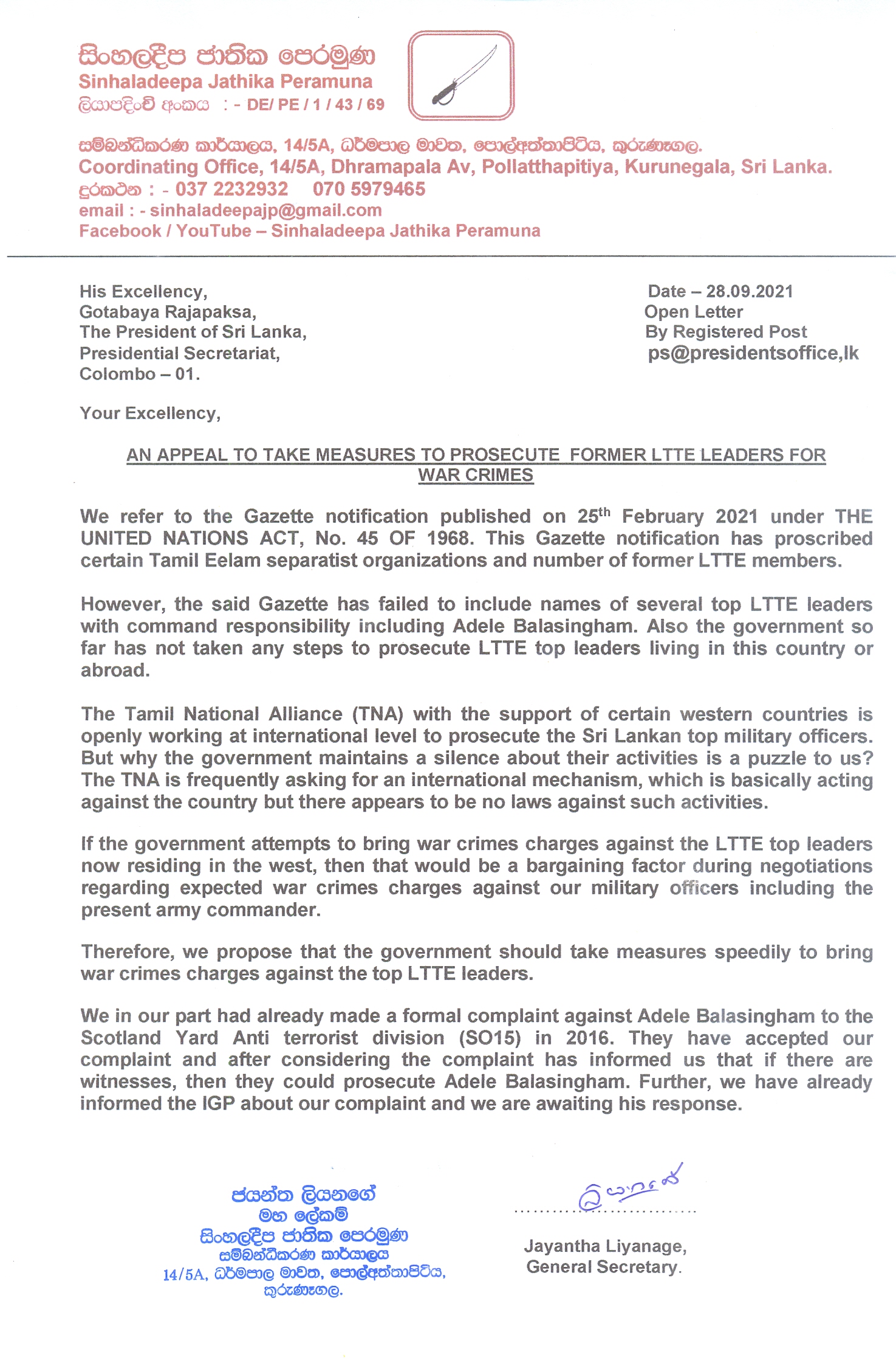 The General Secretary of the SJP, Jayantha Liyanage has written to President of Sri Lanka and requesting to prosecute the LTTE terrorist leaders, politicians and Tamil diaspora who supported, promoted and glorifying Tamil terrorism and separatism. The Sri Lankan government issued a gazette in February b2021 and proscribed numbers of individuals and organizations as terrorists. The SJP emphasizes that government shall put into the actions such proscription to be a meaningful proscription.