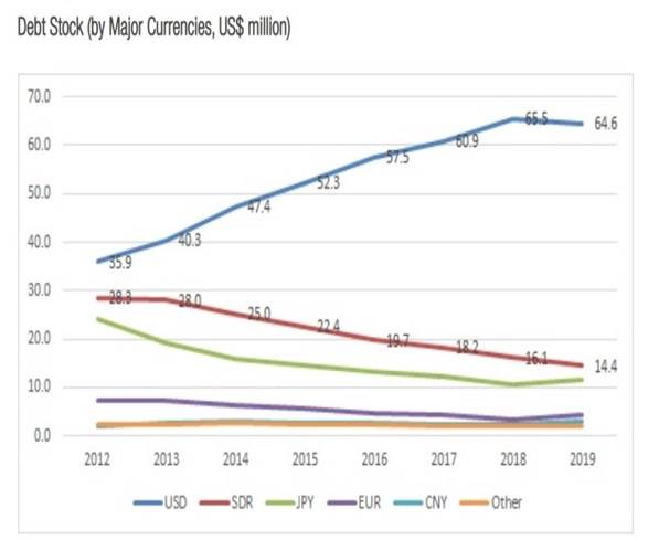 As of the end of 2019, less than 5% of Sri Lanka’s foreign debt was denominated in China’s currency the yuan (CNY). On the other hand, nearly two-thirds, 64.6%, was owed in US dollars, along with an additional 14.4% in IMF special drawing rights (SDR).