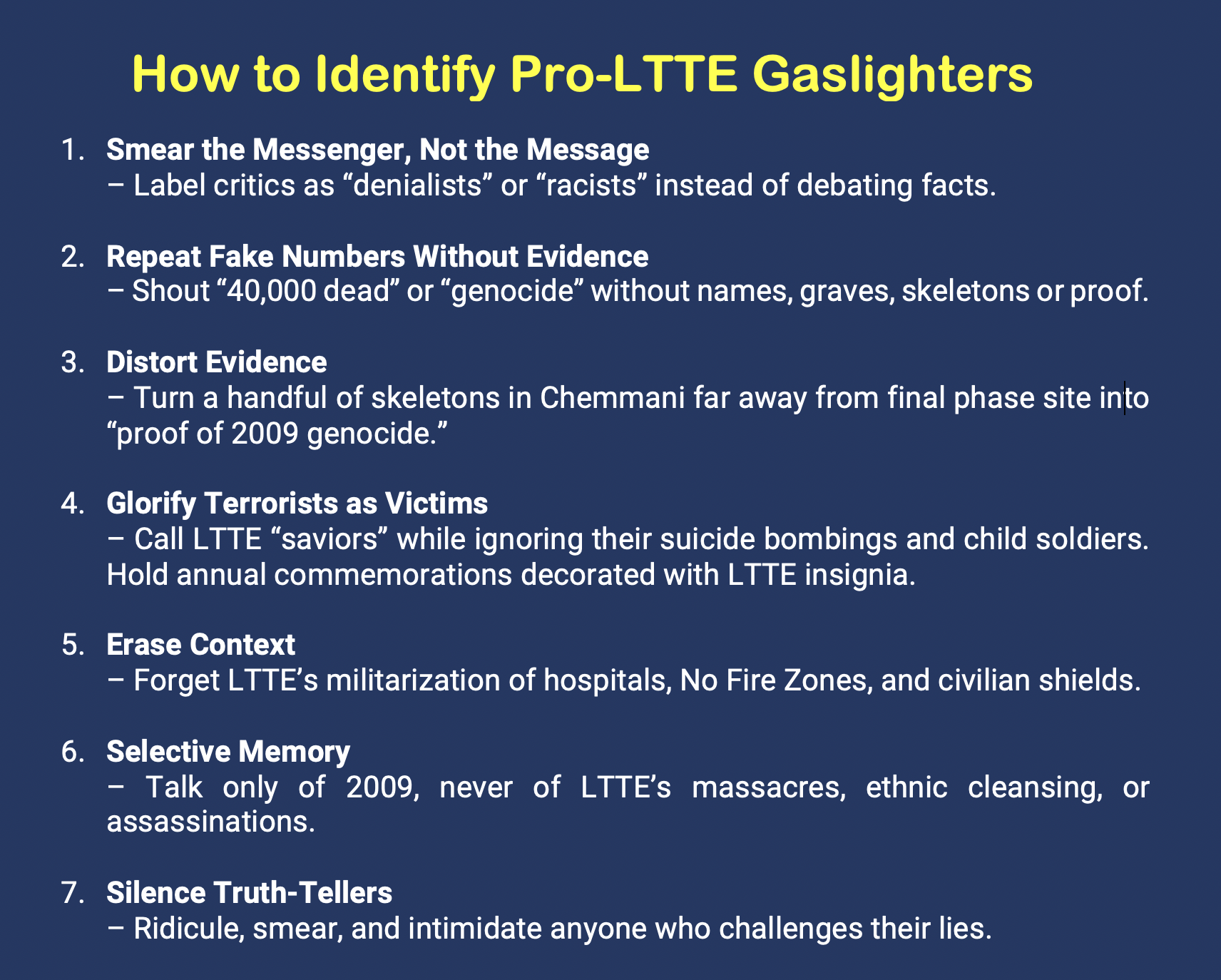 The gaslighters seek to neutralize truth by destroying credibility through smear. We must refuse to let them succeed. The past must be excavated honestly, remembered fully, and taught fairly. That is the only road to genuine reconciliation. We don’t need to reconcile with terrorists. The armed forces fought against terrorists not Tamils. It’s a pity that terrorist promoters who display LTTE flags, emblems and insignia are the ones continuing to keep alive the flame of terror towards separatism though holding foreign passports, living in foreign climes, educating their children overseas but wanting their own people back home to return to the jungles and destroy another generation of Tamil children as child soldiers. Tamils in Sri Lanka should not fall for these tricks any longer.
