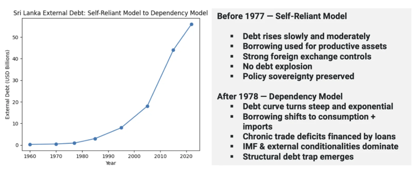 Sri Lanka’s debt curve tells the entire story: before 1977, borrowing was slow, controlled, and productive; after 1978, debt exploded exponentially — proving the shift from a sovereign development model to a structurally dependent economy.