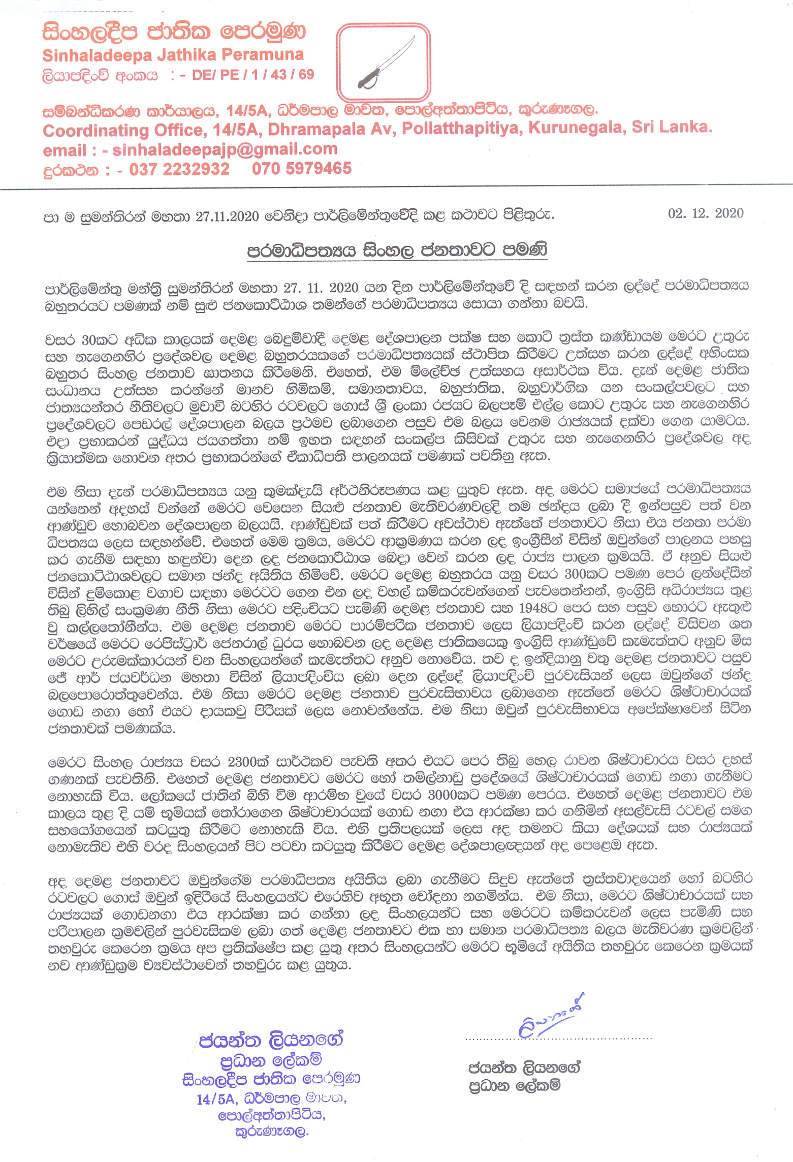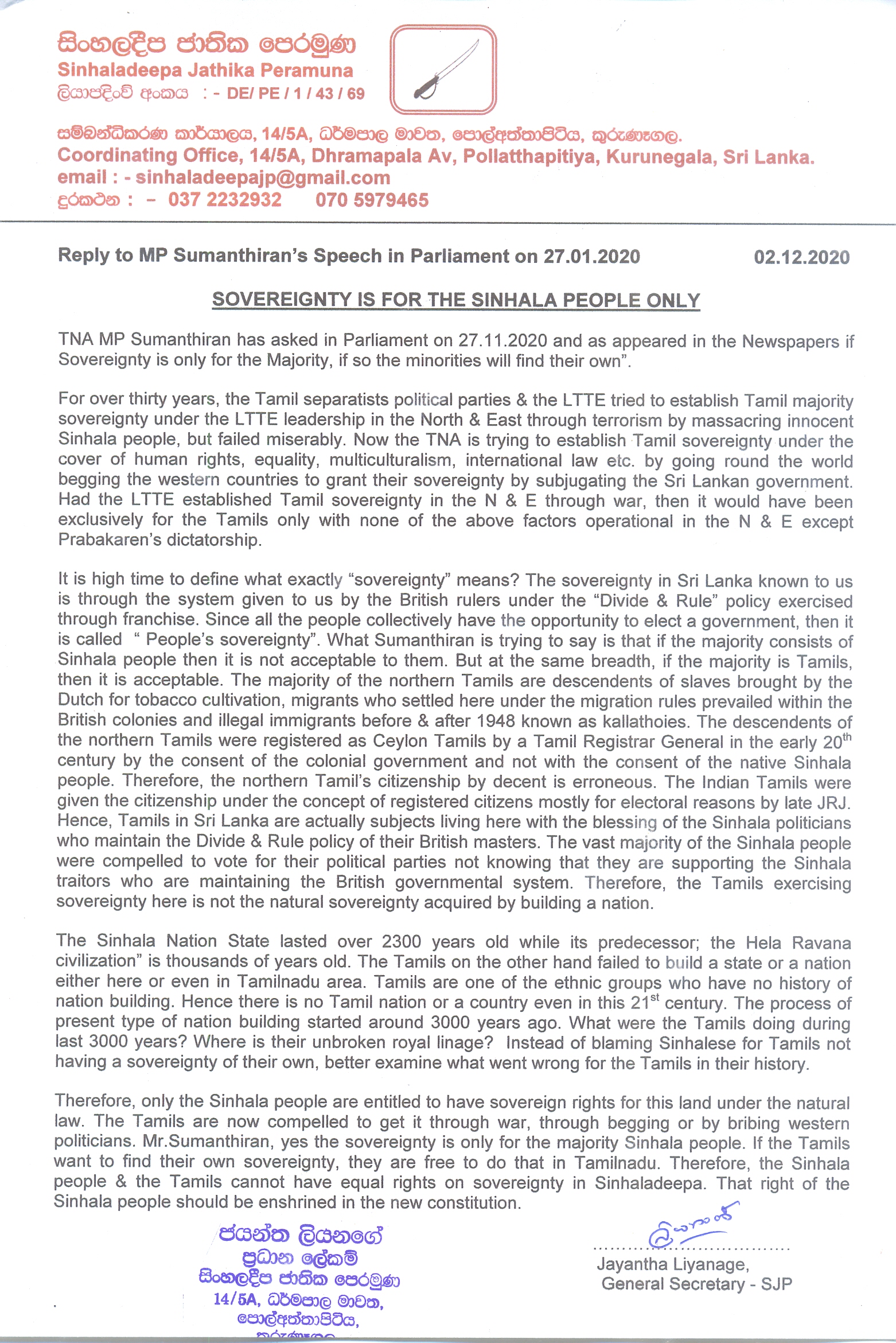 The General Secretary of the SNF, Mr. Jayantha Liyanage has issued the press statement and it has stressed that only Sinhala people are entitled to the sovereignty right of this land under the natural law.