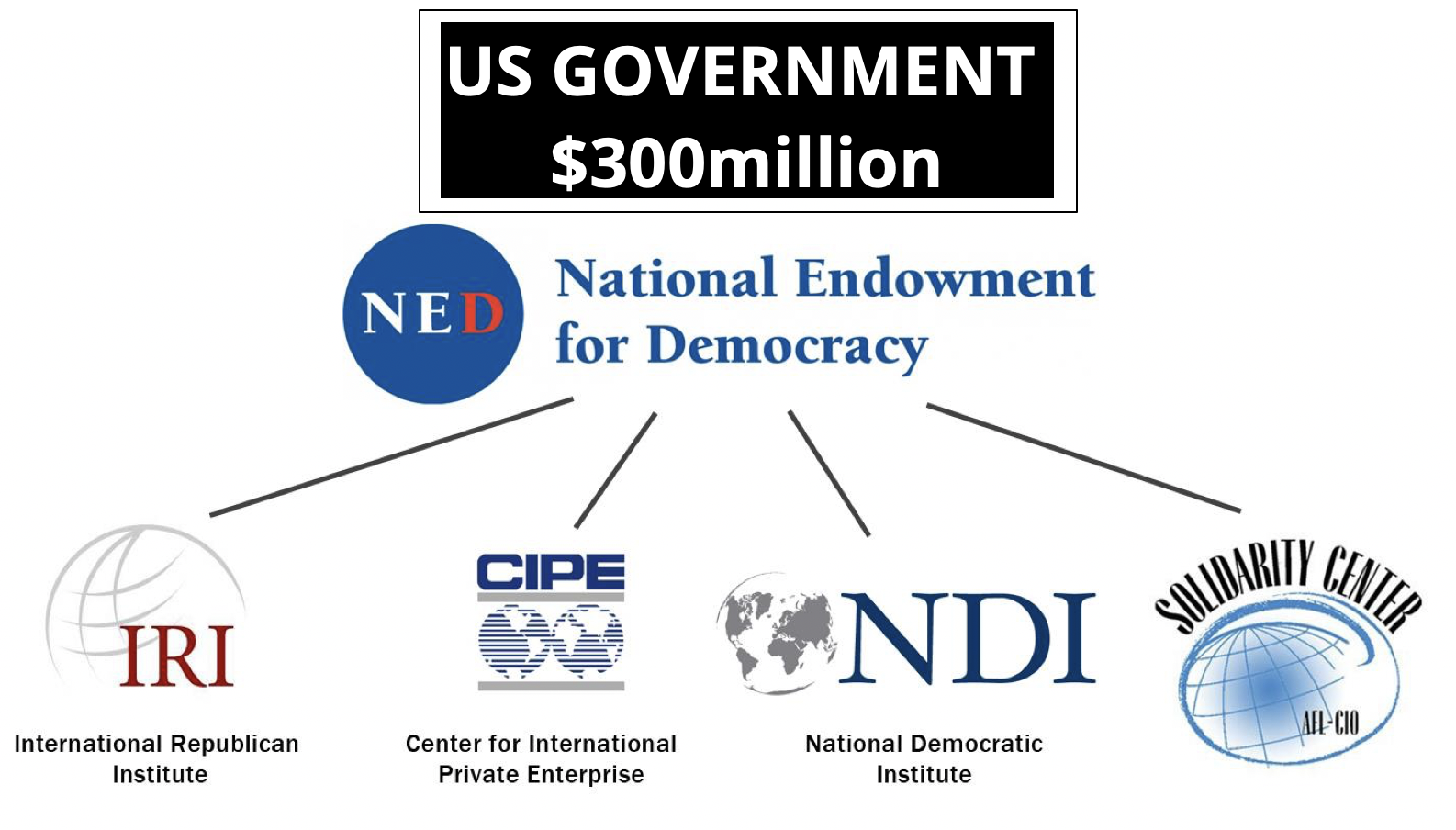 NED (National Endowment for Democracy) & its 4 core grantees – NDI (National Democratic Institute)IRI (International Republican Institute), Solidarity Center & Center for International Private Enterprise (CIPE)