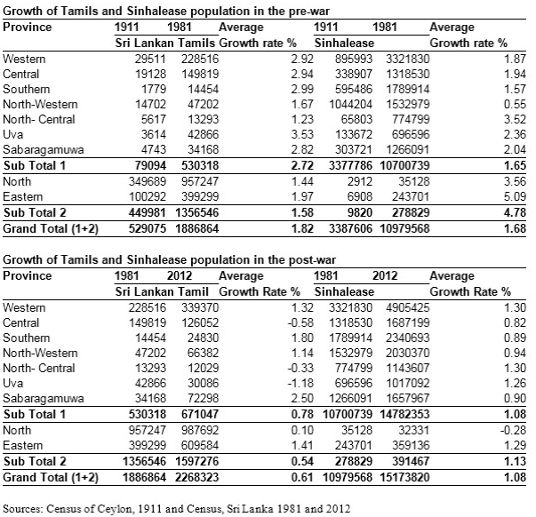 Secondly, please consider the following census growth tables from pre-war and post-war while also considering the mass emigration of Tamils. According to Dr. Dhammika Herath in Ottawa “Even during the 28 years of LTTE brutalities from 1981 to 2009, Sri Lankan Tamil population GREW in almost all the Sinhala dominating provinces as per following table. Particularly in the Western province where about 60 percent of the country’s GDP is generated, the Tamils grew by 1.32% per year from 228, 516 to 339, 370 where the majority Sinhalese grew at a lower rate of 1.30% per year. Western province is the heart of Sri Lanka and the so called ” Sinhala-Buddhist centric government policies pogroms, land grabs and ethnic cleansing” could have completely wiped out Tamils in the Western province. Lo and behold, in Western Province, Tamil population increased by 48.5% from 1981 to 2012 whereas the Sinhalese (so called perpetrator) increased ONLY by 47.6% during the same time.”