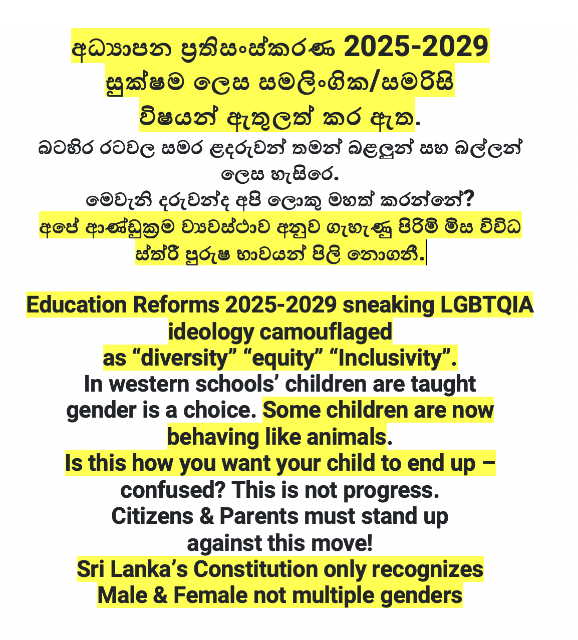 Sri Lanka’s New Education Reforms (2025–2029), led by Prime Minister and Education Minister, have sidelined history and Buddhism—pillars of Sri Lanka’s civilizational consciousness—while quietly embedding gender ideology and LGBTQIA+ narratives under the dangerous banners of “equity,” “inclusion,” and “diversity.” These reforms seek to sexualize children at an innocent age, confuse identity, and normalize immorality as progress. There is a deliberate attempt to undermine Sri Lankan nationalism and identity by:
