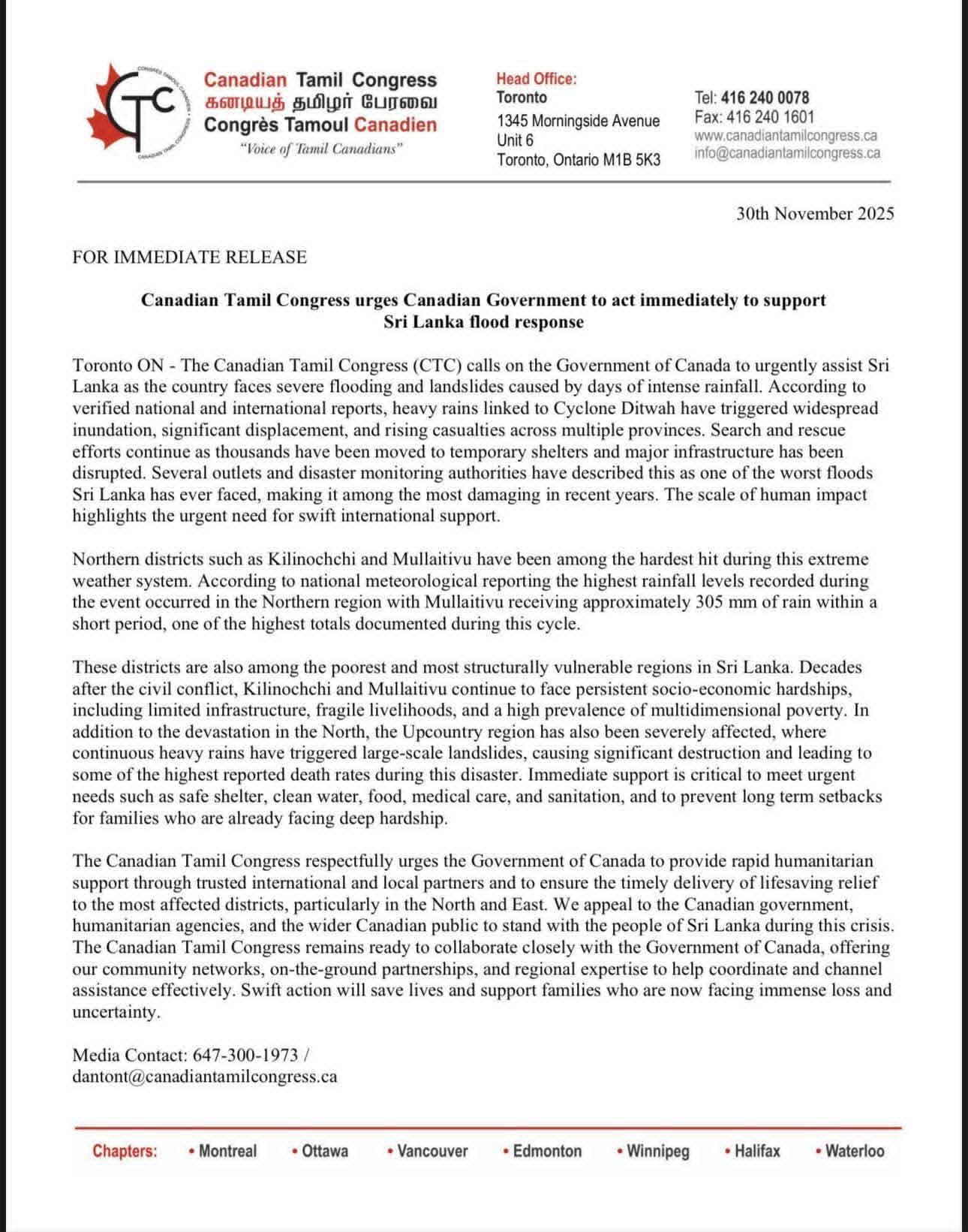 The pro-LTTE Tamil terrorists’ organization called Canadian Tamil Congress, has requested the Canadian Government which is a sympathizers of the LTTE Tamil terrorists and promoting and glorifying the Tamil terrorism in Canada and globally, to provide aid related to the devastated recent flood victims in particularly to the North and East two provinces where some majority people are minority Tamil community who migrated to Sri Lanka as labourers and invaders few decades ago.