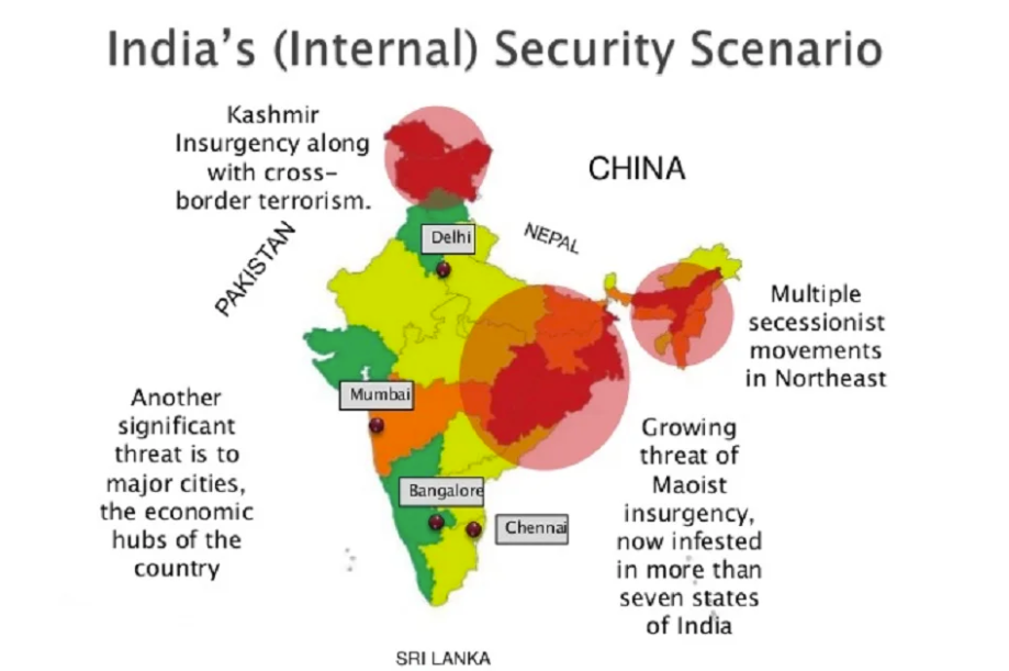 India currently suffers Islamist separatist issue in Kashmir, Punjab Khalistan revival, Nagaland sovereignty bid, Kuki-Meitei ethnic war in Manipur, ULFA in Assam, Tribal militancy in Meghalaya, insurgency in Mizoram, ethnic militancy in Tripura, Maoist insurgency in Central India, Tamil separatist quest in Tamil Nadu.