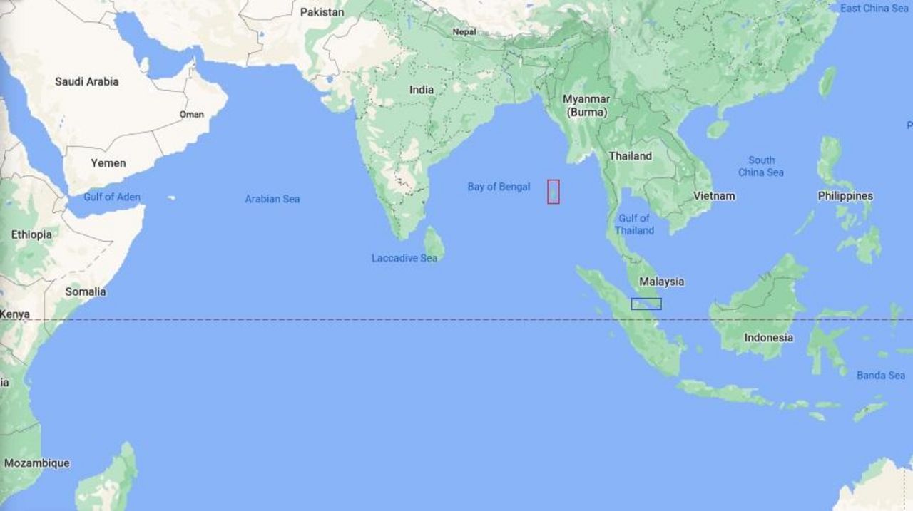 Indian Ocean: Red box identifies the Andaman and Nicobar Islands, yellow box is the Malacca Strait. (Credit: openstreetmaps)